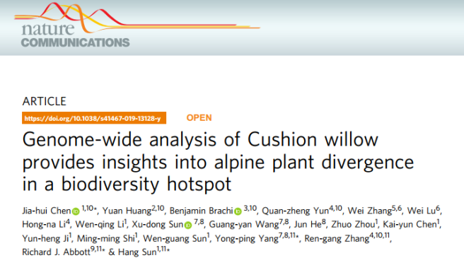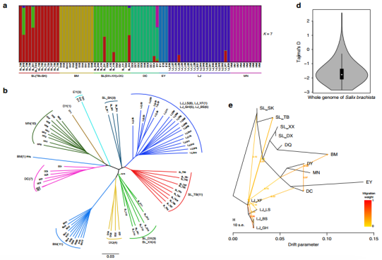 研究結果1:小墊柳具有顯著的種群分化,盡管其具有長距離傳播的能力,但種群間的基因流微弱;小墊柳自晚中新世以來的群體波動與劇烈的氣候波動耦合,天空島效應、多樣而異質的生境和氣候波動可能是驅動小墊柳種內群體分化的重要因素;