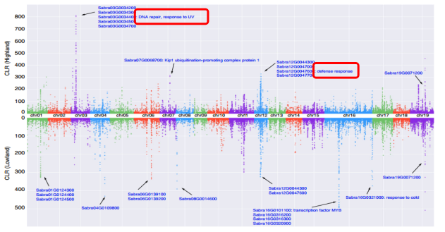 研究結果2:自然選擇在小墊柳高、低海拔群體中的作用區域和強度都具有顯著的差異,說明分布于橫斷山區海拔高差大、生境多樣而異質的物種可能在自然選擇的作用下發生種下的種群分化(Sabra3G0034400DNA修復,Sabra12G0047600細菌防御應答,Sabra16G0101100細胞對DNA損傷刺激的應答和對寒冷的應答)。