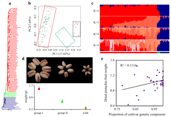 研究結果1:揭示了開心果的兩步馴化過程(栽培種質分為兩個群。栽培種Group I的LD值最高,栽培種Group II和野生開心果的LD衰減值相近。Group II包括 Qazvini,Italiaei和Badami Zarand在內的5種類型的個體,且這些種質被記錄為古代具有種子的材料);