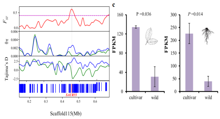 研究結果2:在開心果中,基因組上約有 9.2 Mb 的區域被鑒定為具有高水平的群體分化,包含665個基因,其中開心果株型可能與 SAUR55 基因的選擇相關,同時該基因 表現出了顯著增加的表達水平;果實重量的變化發生在馴化與人工選擇期間(CYCD7-1基因)。
