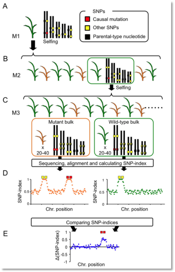 (1)該文章是對突變性狀定位的一種延伸,也是對mutmap方法的一個補充,主要區別是如果隱形突變個體無法正常發育在幼苗期出現死亡,因此無法與野生親本雜交構建分離群體,所以該方法巧妙的選擇了突變位點雜合的個體進行自交,從而在自交M3或者M4選擇極端個體構建混池進行后續分析。