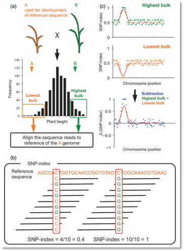 BSA(bulked segregant analysis)又叫集群分離分析法,該方法主要是選擇雙親群體分離后代中具有極端表型的個體進行混樣,通過比較不同極端混樣池之間的多態性標記的差異,從而篩選出與性狀相關的分子標記,實現目標基因的定位。BSA分析早期使用的都是傳統分子標記,根據標記與性狀共分離(緊密連鎖)得到定位區間,不過由于其標記密度低、定位精度差、實驗操作繁瑣已經逐漸不再使用。近年來,BSA方法和高通量測序相結合,通過比較不同混池間SNP的頻率差異或者比較混池間純合SNP的密度的差異,實現基因的定位,高通量測序方式以其簡單、快速、準確、高性價比的特點受到科研工作者的青睞。那么,對于不了解BSA的研究者來說,如何快速了解BSA的發展歷程、原理方法、應用領域,如何快速上手BSA分析,今天大師兄為大家推薦幾篇BSA代表性文章,讓你輕松搞定BSA,趕緊上車。