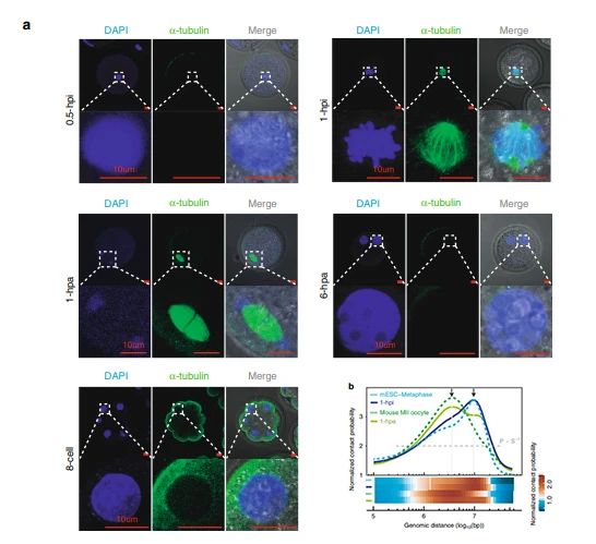 免疫熒光染色在1-hpi和1-hpa胚胎中檢測到紡絲裝置凝聚的染色體,這與其他階段胚胎中帶有核膜的間期染色質形態不同(圖2a)。進一步分析表明,1-hpi胚胎的P(s)曲線與小鼠ESC中期相似,在10Mb時迅速下降,而1-hpa胚胎的P(s)曲線與小鼠MII卵母細胞相似,在4Mb時突然下降(圖2b)。這表明當供體細胞在去核卵母細胞中被人工激活1個小時(1-hpa)后,基因組經歷了從類有絲分裂中期向類第二次減數分裂中期的轉變。