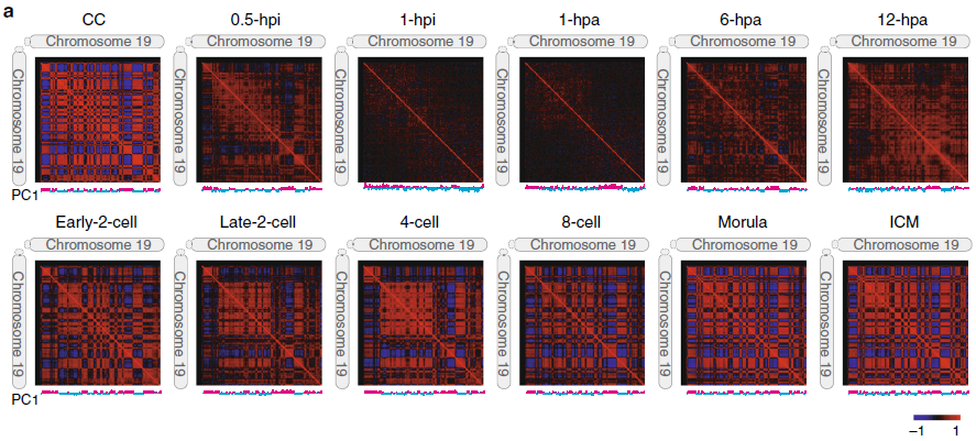 不同時期的胚胎的染色質三維構象見下圖,圖中分別展示了分辨率為100kb和40kb時的Hi-C互作矩陣。將CC(Cumulus cell)核注入無核卵母細胞后,染色質結構TADs和Compartments迅速溶解,并在6-hpa胚胎中部分恢復。令人驚訝的是,1-hpi和1-hpa單細胞胚胎遠端相互作用明顯較少,并顯示出一致的相互作用模式,這與中期染色質組織狀態高度相似。