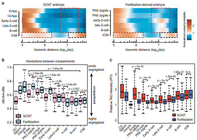 作者將小鼠SCNT與正常受精胚胎發育Hi-C公共數據集進行分析,發現SCNT胚胎在二細胞期的遠距離(>2 Mb)相互作用較正常受精胚胎明顯降低。同時,早期(2到8細胞期)正常受精胚胎與SCNT胚胎的Compartments及TADs也存在著明顯的差異。