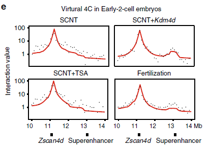 研究表明小鼠SCNT胚胎在合子基因組激活(ZGA)時期有大量的基因未能被正常激活。于是,作者探究了染色質空間結構的異常是否會導致增強子與啟動子之間的相互作用無法成功建立。在早2細胞胚胎,發現關鍵基因Zscan4d的啟動子與上游的超級增強子的SE-P相互作用在受精卵中很明顯,而在SCNT胚胎中則不存(圖5)。