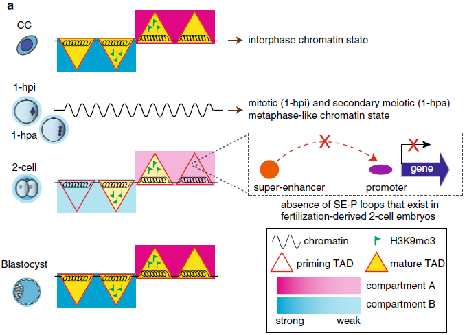 SCNT胚胎發育6小時(6-hpa)進入擬原核期(對應正常受精胚胎PN3時期)后,出現了較弱的TADs(拓撲相關結構域)信號,并持續減弱至早期2細胞期,在2細胞晚期到8細胞卵裂期逐步重新建立,直到囊胚期成熟。