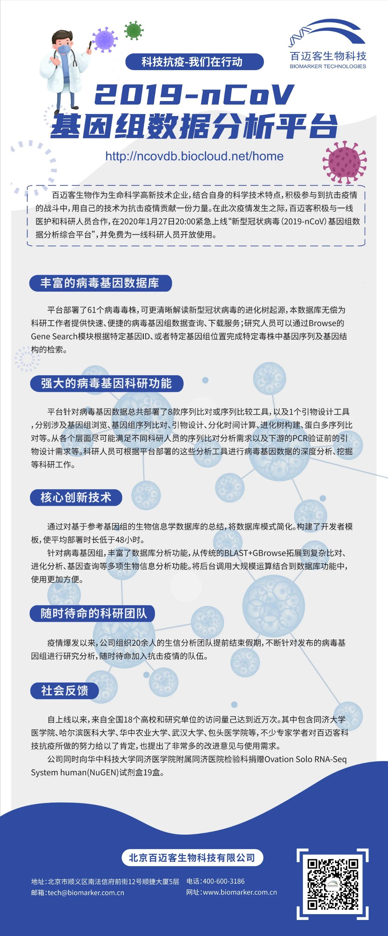 在疫情防控這個特殊的戰場,百邁客作為三代測序和生物云-BMKCloud服務提供商,結合自身的技術特點,在疫情爆發初期積極的參與到抗擊疫情的戰斗中,與一線的醫護和科研人員合作,結合一線的需求,積極調動各種資源,經過十幾天夜以繼日的開發,通過對各數據庫中的新型冠狀病毒數據進行合理整合分析,于2020年1月27日20:00時及時上線了首版“2019-nCoV新型冠狀病毒基因組數據分析平臺”(http://ncovdb.biocloud.net/home)?。本數據庫配合國家公共資源數據庫為社會提供更全面、及時、準確的數據資源。為我們的一線科研人員提供免費服務。