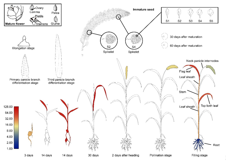 11個不同的組織:3日齡種子(種子)、2周齡整株苗(苗)、根、莖、2周齡苗的第一片全展葉(葉1),30日齡植株頂第二葉(葉2)、旗葉(葉3)、第四葉(葉4)、未成熟的圓錐花序(圓錐花序1)、授粉期圓錐花序(圓錐花序2)、灌漿期圓錐花序(圓錐花序3);葉2有5個生物學重復,其他有3個生物學重復。