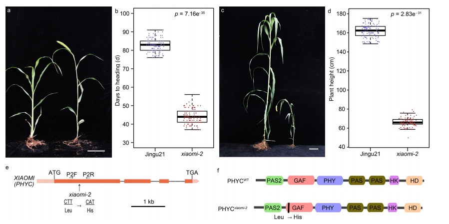 “小米”主要有以下特征:(1)表現出極早的開花表型:抽穗期39天(播種后天數,DAS)左右,約70天內完成了生命周期。而野生型(晉谷21,WT)的平均抽穗期約為82 天(DAS),成熟期為130 DAS(圖1b、c);(2)“小米”比野生型矮(圖1b),但結實率高12.83%,且種子大小沒有顯著差異(圖1d);(3)“小米”在短日(SD,10h光照/14h暗)條件下比長日(LD,16h光/8h暗)條件下的抽穗晚了約一個月,表明“小米”的早期抽穗依賴于LD條件(圖1e)。通過延長日長和優化其他條件,可以將“小米”的生命周期縮短到65天,株高約為29厘米(圖1f),每年可以在成長室里完成5到6代。(4)僅需較小的種植面積,類似于種植等量的擬南芥植株。
