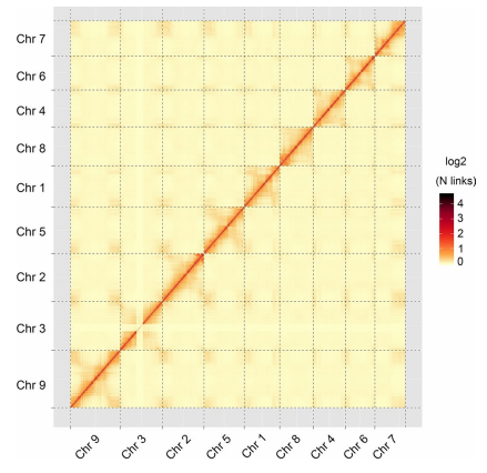 為了便于“小米”作為模型植物的使用,使用PacBio平臺組裝出429.94 Mb基因組 v1.0(k-mer預估438.26 Mb),contig N50高達18.8?Mb,Scaffold N50為42.41 Mb,并且僅包含48個Gap。其中399.4 Mb通過Hi-C錨定在9條染色體上(掛載率~93%;圖5)。根據Illumina DNA比對,組裝的錯誤率約為0.001%(每100kb有一個錯誤)。BUSCO評估結果為97.78%。這些結果表明“小米”基因組v1.0可以作為研究界的金標準參考。