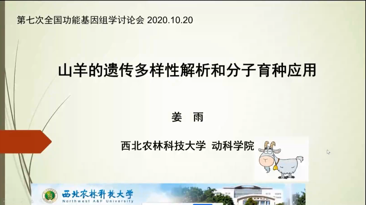 西北農林科技大學姜雨教授風趣而系統的解析了世界山羊品種的遺傳來源,并在山羊上鑒定出關鍵抗病基因MUC6。展示了基于世界主要家畜的SNP和CNV等變異信息和頻率構建的家畜遺傳變異數據庫。最后表示其研究團隊構建了適用于中國綿羊和山羊的基因芯片,將為羊的基因組選擇育種服務,而該芯片也將進入分析應用階段。姜老師的研究結果引起了線上基因組學相關領域眾多學者的熱烈討論。