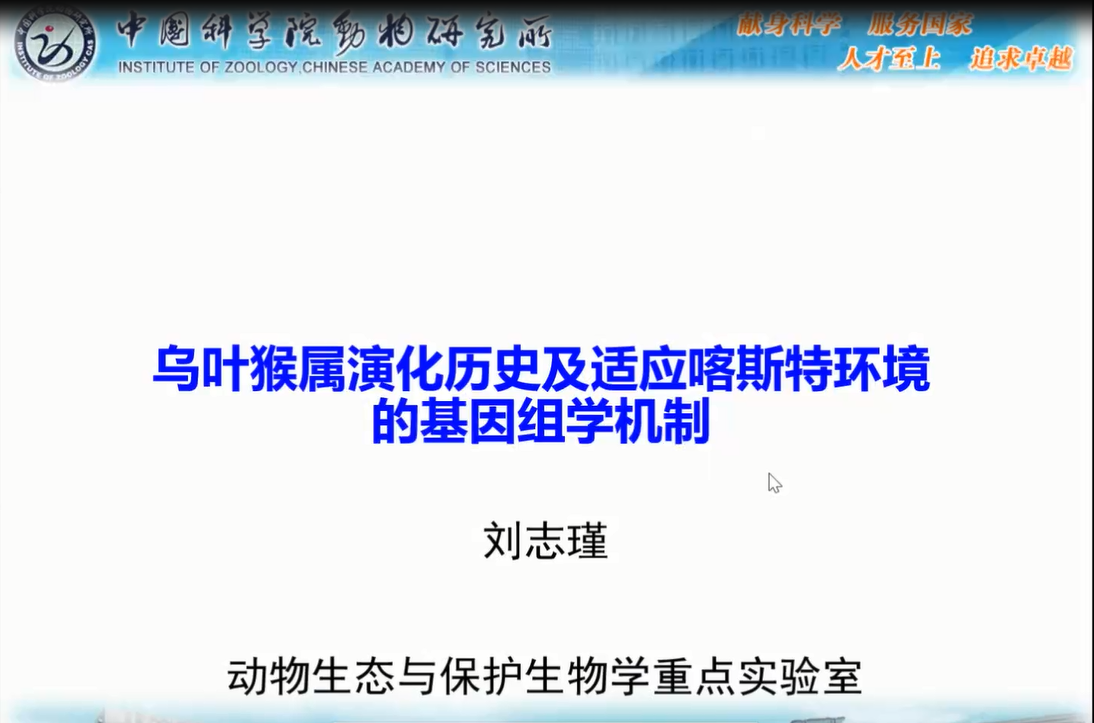中國科學院動物研究所劉志瑾副研究員詳述了烏葉猴屬中黑葉猴種組、銀葉猴種組、郁烏葉猴種組三個種組演化地位和種群動態。并對石山葉猴和雨林葉猴兩大類群以及黑葉猴種組的分化情況進行了深入闡述。研究最后推斷EDNRB基因是在自然選擇過程中,在白頭葉猴遺留下來的環境適應性毛色表型的關鍵機制。劉老師的報告使相關領域學者對靈長類生態分類群中的基因-環境相互作用和生理-形態適應機制有了新的認識。