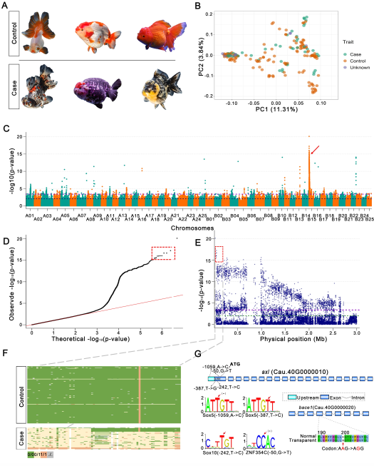 背鰭作為金魚一重要的表型特征,在不同變種中形態不一,背鰭是區分Wen金魚和Egg金魚的顯著特征,背鰭的縮小是Egg金魚進化的關鍵特征。通過Wen金魚和Egg金魚雜交后代F1背鰭性狀分離比,暗示了了背鰭特征受多個基因位點控制,可能具有母體遺傳效應。對96只有背鰭和87只無背鰭金魚的全基因組關聯分析GWAS研究分析發現跨越13條染色體上的8.96 Mb區域上的378個基因與背鰭性狀相關(圖6),85.2% (322)個基因位于A亞基因組,大部分位于五條染色體上,包括ChrA09,ChrA07,ChrA22,ChrA16和ChrA05,比位于B亞基因組上的背鰭相關基因的數量高得多,這表明背鰭相關基因不對稱的亞基因組分布,GO和KEGG分析表明,該性狀的候選基因可能參與了“細胞表面受體信號傳導”途徑,“信號轉導”,“跨膜轉運”,“骨骼系統發育”和“初級代謝過程和器官氮化合物代謝過程”。進一步通過與斑馬魚直系同源基因基因敲除品系表現出的突變表型分析發現,二氫葉酸還原酶(dhfr)可能在某種程度上與魚鰭是否存在相關,該基因可能在金魚人工選擇過程中,在有無背鰭這一表型中發揮重要作用。