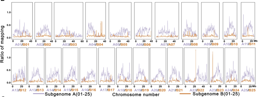 在過去的50年里,一直推測金魚基因組是四倍體。近期研究表明,鲃亞科Barbinae (2n = 50) 中的鯉魚科可能是金魚最接近的二倍體祖先,進而形成這樣一個假說:鲃亞科(Barbinae)可能是二倍體金魚譜系的祖先種,研究中進一步進行了6個代表性的二倍體鲃亞科物種(包括條紋小鲃,大鱗高須魚,長臀鲃,黑鰭袋唇魚,施氏魮和裂峽鲃)的全基因組鳥槍測序并進行基因組組裝。金魚染色體可清晰分為兩個亞基因組,通過reads多序列比對,發現金魚來自兩個祖先世系,其中一個是鲃亞科共有的,進一步將與鲃亞科比例高的reads所在染色體定為A亞基因組(ChrA01~A25)并將其余染色體定為B亞基因組 (ChrB01~B25)(圖2)。此外,基于1個核基因的系統進化分析,即結締組織生長因子like基因在二倍體金魚中僅有1個拷貝,但在四倍體金魚中含有2個拷貝,結果顯示鲃亞科物種的同源基因與金魚A亞基因組同源基因聚類到一起(斑馬魚和鯉魚作外群)。研究結果表明,A亞基因組可能起源于鲃亞科內的祖先物種,而B亞基因組的二倍體祖先可能已經滅絕或起源于未知的鯉科魚類譜系,推測金魚的起源可能是由于異源多倍化事件。金魚的A和B亞基因組分別包含28,133和26,141個基因。同時通過金魚10個不同組織的RNA-seq測序,探索了A和B兩個亞基因組之間的差異表達,發現同源基因在兩個亞基因組之間表現出不對稱的表達模式,而全基因組范圍內的表達水平總體上更偏好A亞基因組。