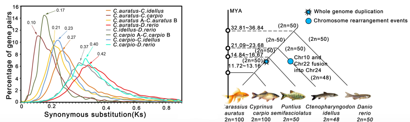 在同源染色體對ChrA01/ChrB01, ChrA04/ChrB04, ChrA05/ChrB05, ChrA09/ChrB09, ChrA11/ChrB11和ChrA15/ChrB15上出現了大片段倒位,盡管整體共線性很強。這些大的片段倒位可能是異源四倍體形成的原因之一。進一步發現,金魚兩個亞基因組(Ks= ~0.17)與鯉魚(Ks= ~0.21)之間的分歧時間(13.28-16.67 MYA),早于金魚和鯉魚之間的分歧時間(7.81?8.77 MYA)(Ks =?0.10)(圖3 A)。此外,文中假設全基因組復制(WGD)事件發生在金魚和鯉魚的共有譜系中,因此它們可能具有相同數量的染色體(2n = 100),染色體基數(2n=50)是二倍體鯉亞科成員的兩倍,暗示這兩個種都是四倍體。同時,發現斑馬魚于~ 32.8-36.8 MYA,與鯽魚、鯉魚和草魚由共同的祖先(LCA)分化而來(圖3 B)。