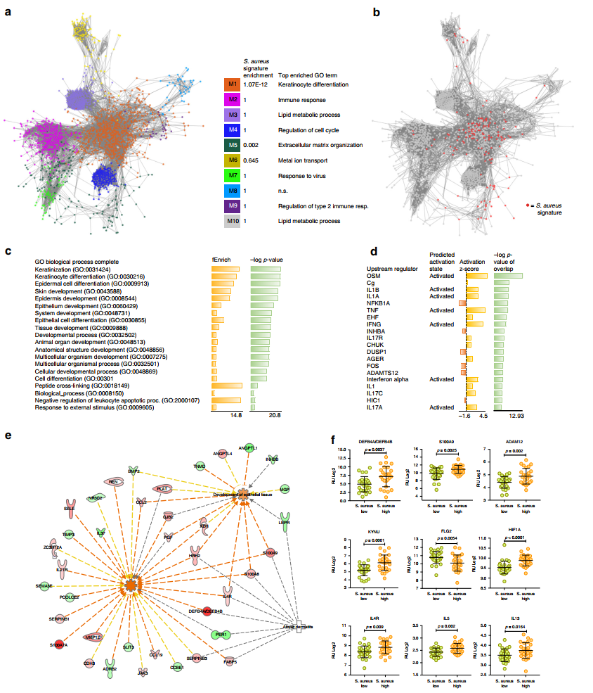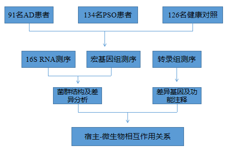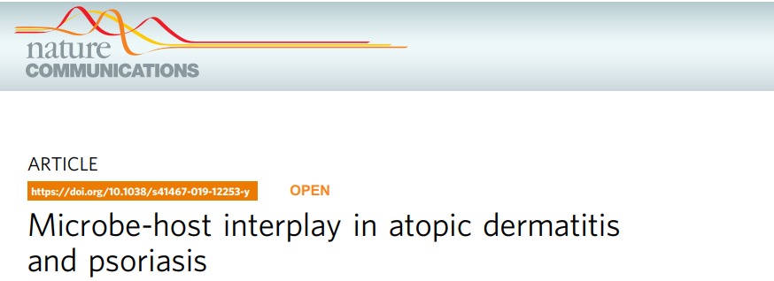 本文通過16S RNA測序、宏基因組測序及轉錄組測序技術研究了特異性皮炎和銀屑病患者皮膚微生物群落結構以及皮膚基因表達模式。發現特異性皮炎和銀屑病與健康對照皮膚微生物組成存在顯著差異。特異性皮炎以金黃葡萄球菌為主并與宿主皮膚屏障功能、色氨酸代謝和免疫激活相關。銀屑病皮膚微生物群落與宿主基因表達存在微弱的關聯性。并為皮膚生態失調的生物標志物和靶向治療提供基礎。