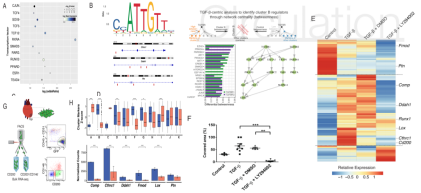 為了進(jìn)一步探尋不同簇在MI過程中的潛在作用,作者通過分析不同簇細(xì)胞百分比的變化,發(fā)現(xiàn)F、H和K簇細(xì)胞百分比在不同時間點保持不變,而B簇在MI前后GFP+細(xì)胞百分比出現(xiàn)了明顯的變化,在健康的心肌中只有2.3%的GFP+細(xì)胞屬于B簇,MI后百分比急劇上升(7dpi為12%,14dpi為34%),隨后在30dpi下降到12%。通過KEGG和GO功能預(yù)測富集分析,與其他簇相比發(fā)現(xiàn)B簇轉(zhuǎn)錄組基因顯著性富集在細(xì)胞外基質(zhì)組織、細(xì)胞增殖、細(xì)胞基質(zhì)粘附相關(guān)信號通路中,明顯B簇細(xì)胞轉(zhuǎn)錄組涉及到結(jié)構(gòu)性(Fmod、Comp)和膠原代謝(Ddah1、Lox、Ptn)相關(guān)的基因,而且通過鑒定發(fā)現(xiàn)Cthrc1可以作為B簇*顯著性標(biāo)志性分子,該基因主要參與血管重構(gòu)和纖維化過程,并且B簇ECM相關(guān)基因高度特異性表達(dá),表明B簇與纖維化過程密切相關(guān)。免疫組化分析B簇標(biāo)志物分子Cthrc1, Ddah1和Fmod在7,14,30dpi的IZ和BZ區(qū)域都存在,同時利用RNAseq表達(dá)譜分析發(fā)現(xiàn)心肌梗死7dpi也存在B簇的表達(dá)特征。通過以上實驗,作者定義B簇為CF一個亞群,其特征有:1)在MI過程中出現(xiàn);2)呈現(xiàn)顯著的動態(tài)纖維化;3)定位在受損的組織中。通過擬時序分析發(fā)現(xiàn)Cthrc1幾乎只在B簇細(xì)胞中表達(dá),而其他的一些活化CF標(biāo)記基因如Postn、 Acta2/αSMA在激活的早期階段表達(dá),這也就預(yù)示著B簇成纖維細(xì)胞是MI反應(yīng)中產(chǎn)生的Postn + CF亞群的最終激活階段。