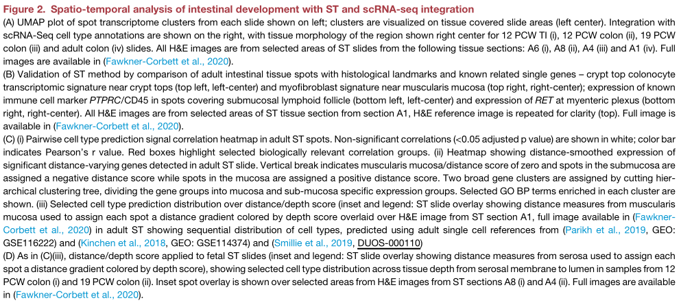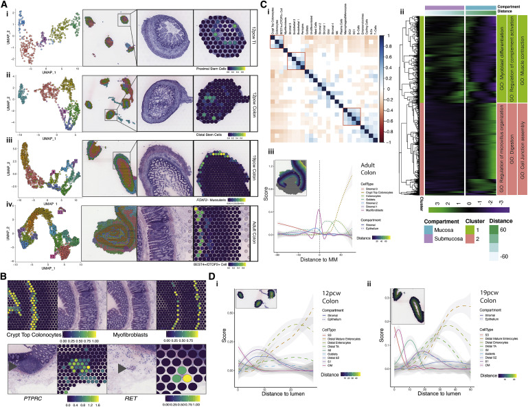 研究人員鑒定了2,893個(gè)與深度相關(guān)的基因(<5%FDR),反映了不同層次的活躍途徑(Figure Cii) -肌肉/神經(jīng)過(guò)程(收縮/軸突形成)向吸收管腔功能(微絨毛組織和消化系統(tǒng)過(guò)程)發(fā)展的深度富集點(diǎn),與細(xì)胞類(lèi)型特征的順序富集相符(Figure?2Ciii)。在胎兒ST顯著的差異包括外肌層和內(nèi)肌層在19個(gè)PCW時(shí)占據(jù)離散的空間層,而不是12個(gè)PCW時(shí)(Figure 2D)。
