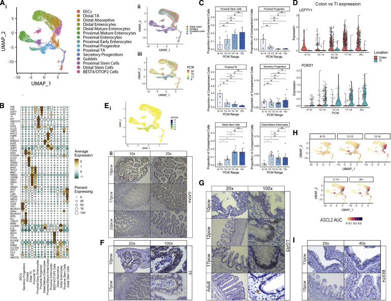 研究人員觀察到近端和遠(yuǎn)端ISCs隨著時(shí)間的推移逐漸增加。這與ISC轉(zhuǎn)錄程序的早期位置差異形成對(duì)比,例如遠(yuǎn)端LEFTY1和近端FOXD1及其下游調(diào)控網(wǎng)絡(luò)基因(Figure3C,3D和S3B)。這些差異由關(guān)鍵的位置信號(hào)轉(zhuǎn)通路支撐,例如,結(jié)腸LEFTY1通過(guò)激活素A受體(ACVR2B)參與了假定的神經(jīng)相互作FigureS3?C1)。在早期發(fā)育中(<12 PCW),研究人員發(fā)現(xiàn)了近端上皮干樣祖細(xì)胞群,該細(xì)胞群發(fā)展為早期腸上皮細(xì)胞。這些細(xì)胞表現(xiàn)出許多原始功能,包括在中胚層分化重要的VTN基因高表達(dá),與ISCs相比,LGR5表達(dá)較少,和ONECUT2表達(dá)參與上皮發(fā)育(Figure 3B和FigureS3?D)。這些細(xì)胞在SI中特異表達(dá)TF GATA4(Figure3Ei), SI是一種小鼠早期內(nèi)胚層調(diào)節(jié)因子,在12 PCW后,其表達(dá)大部分丟失這些細(xì)胞高表達(dá)轉(zhuǎn)鐵蛋白(TF)( Figure3B和3F),證實(shí)了鐵代謝在絨毛形成中的重要性。LGR5是一種典型的ISC基因,在妊娠早期(<12 PCW)的近端/遠(yuǎn)端廣泛檢測(cè)到低水平ISCs和干樣祖細(xì)胞(Figure3B和FigureS3D)。原位雜交(ISH)證實(shí)了在10PCW處彌漫的LGR5表達(dá),后來(lái)定位于隱窩堿基(Figure3G),類(lèi)似于在雞和小鼠發(fā)育中報(bào)道的Lgr5的行為。即使在隱窩形態(tài)建立之后(如19 PCW之后),ISC仍分別構(gòu)成遠(yuǎn)端/近端樣本中捕獲的上皮細(xì)胞的18%–22%(Figure3C),高于成人結(jié)腸的scRNA-seq研究捕獲的3%-4%。與此相符,研究人員發(fā)現(xiàn)ASCL2?TF模塊(包括下游目標(biāo)LGR5)隨著發(fā)育時(shí)間的增加而顯著增加(Figure3H)。