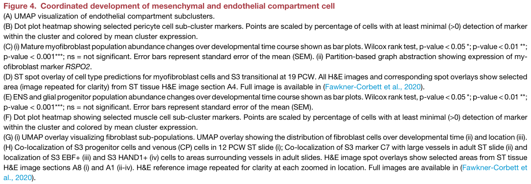 為了更好地理解S3亞型功能,研究人員研究了RL互作,注意到與EC的大量串?dāng)_預(yù)測(cè)(FigureS6D)。其中許多是通過(guò)調(diào)節(jié)結(jié)腸成纖維細(xì)胞中組織纖溶酶原激活受體LRP1介導(dǎo)的。為了在ST數(shù)據(jù)中證實(shí)這一點(diǎn),研究人員進(jìn)行了RL空間共表達(dá)分析,該分析確定了在空間上對(duì)隱窩頂部進(jìn)行強(qiáng)空間共定位的RL對(duì),例如CEACAM1和CEACAM5(FigureS6Ei)。在成人和胎兒組織中觀察到LRP1與血管外基質(zhì)的關(guān)鍵成分HSPG2配體的顯著共定位(p = 2.17×10-112和p = 2.37×10-29(成人);p = 2.9×10-19和 p = 0.005(12 PCW) (Figure S6Eii和S6Eiii)。在胎兒ST中,研究人員將S3簇定位于與EC相關(guān)的深度和區(qū)域(Figure4Hi),將幾種S3特異性基因(如FigureC7)的表達(dá)定位于成年組織中與脈管結(jié)構(gòu)相鄰的斑點(diǎn),因?yàn)檫@些結(jié)構(gòu)比胎兒切片更清晰可見(jiàn)(Figure4Hii)。將胎兒細(xì)胞類(lèi)型標(biāo)簽轉(zhuǎn)移到成人ST上,發(fā)現(xiàn)S3 HAND1 +和S3 EBF +細(xì)胞的成年配對(duì)體聚集在大血管周?chē)?Figure4Hiii–4Hiv),突顯了這些細(xì)胞在形成腸血管支持位支持生態(tài)位中發(fā)揮的作用,已通過(guò)成對(duì)細(xì)胞類(lèi)型信號(hào)相關(guān)性分析證實(shí),其中EC,周細(xì)胞和“S3”型成纖維細(xì)胞信號(hào)在同一ST點(diǎn)內(nèi)相關(guān)(Figure 2Ci)。