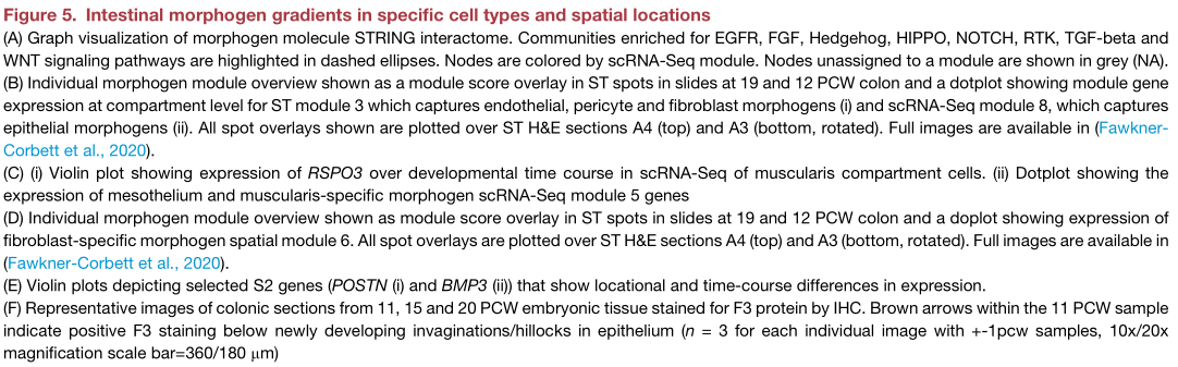 理解腸道發(fā)育的基本問(wèn)題是局部形態(tài)發(fā)生梯度及其拮抗劑是如何塑造腸絨毛形態(tài)發(fā)生的。研究人員創(chuàng)建了一個(gè)涉及8條途徑的基因形態(tài)發(fā)生圖,用以闡明這些分子在空間和時(shí)間上的作用。利用共表達(dá)分析確定了11種細(xì)胞類(lèi)型特異性和13種空間共定位的形態(tài)發(fā)生模塊,在所有ST中對(duì)模塊活性進(jìn)行了評(píng)分(Figure5A和S7?A)。這些模塊通常與ST中的組織深度對(duì)齊,空間模塊3由來(lái)自EC、成纖維細(xì)胞和周細(xì)胞起源的形態(tài)發(fā)生子組成,包括LRP1,并且在組織深處(Figure5?Bi)。上皮特異性模塊表達(dá)了Hedgehog通路(IHH)的基因,例如在Wnt信號(hào)中起重要作用的卷曲的共受體LRP5,并位于管腔附近(Figure5?Bii)。另一個(gè)含有肌纖維母細(xì)胞成分的細(xì)胞,具有形態(tài)發(fā)生原WNT2B和受體RSPO2,在12PCW時(shí)出現(xiàn)彌漫性,并在以后逐漸定位(FigureS7?B)。這與發(fā)現(xiàn)成熟的成肌纖維細(xì)胞在上皮成分后出現(xiàn)的發(fā)現(xiàn)一致,表明ISC-成纖維細(xì)胞信號(hào)傳導(dǎo)回路直到隱窩形成后才建立。WNT2B由間皮表達(dá),在成肌纖維細(xì)胞分化之前提供了配體的唯一來(lái)源(FigureS7B)。類(lèi)似地,RSPO3,其可以用信號(hào)通知經(jīng)由ISC的LGR5(FigureS7Ci)在間皮/肌層模塊中很高,主要在12 PCW之前見(jiàn)到,然后隨著時(shí)間的流逝隨著組織深度的增加而消失(Figure5C)。這表明,隨著腸的生長(zhǎng),原本可能因?qū)娱g物理距離的增加而被打破的形態(tài)梯度,可以通過(guò)依次發(fā)育的細(xì)胞類(lèi)型的表達(dá)而恢復(fù)。