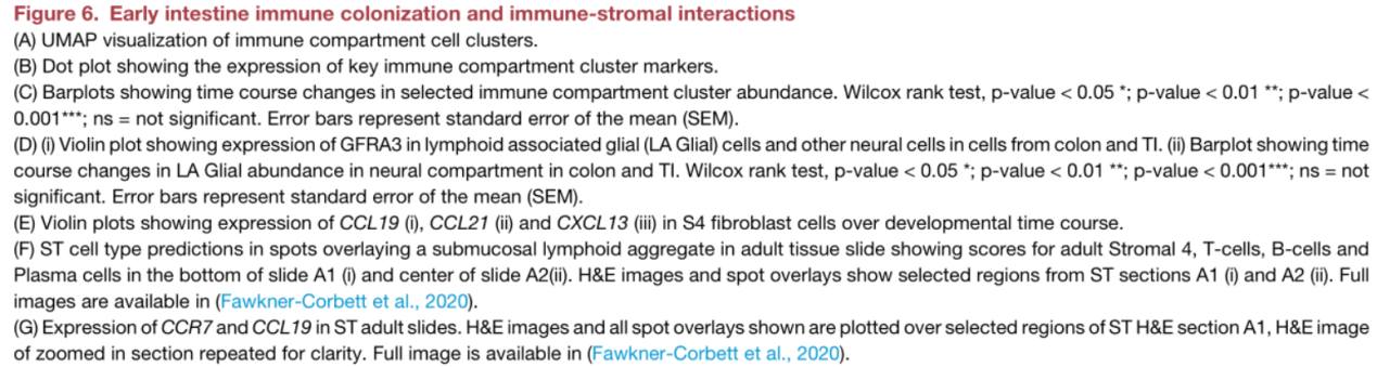 為了在空間上確認(rèn)這些相互作用,研究人員研究了成人ST,其中粘膜下淋巴濾泡被視為獨(dú)特的結(jié)構(gòu)。S4和免疫細(xì)胞(例如CD3和CD19)的關(guān)鍵標(biāo)記基因在這些卵泡中和周?chē)磉_(dá),因子分析證實(shí)了各種成年免疫細(xì)胞(B細(xì)胞,T細(xì)胞和髓樣細(xì)胞)和此處定位的S4細(xì)胞類(lèi)型(Figure6) F)。研究人員還發(fā)現(xiàn)ST中關(guān)鍵RL對(duì)的顯著共定位(包括CCR7 / CC19(1個(gè)點(diǎn)內(nèi)p = 1.098×10 -10,半徑內(nèi)p = 5.59×10 -49)(Figure6G)。表明S4細(xì)胞是成年結(jié)腸中與卵泡相鄰的成纖維細(xì)胞,在胎兒GALT發(fā)育過(guò)程中以時(shí)間依賴(lài)性方式出現(xiàn)。
