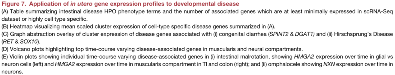 該研究在時(shí)間方面允許研究隨著發(fā)育時(shí)間而變化的疾病基因(Figure7D),并可以提供與時(shí)間相關(guān)的信息,突出顯示PCW前12膠質(zhì)細(xì)胞和IM祖細(xì)胞表達(dá)的基因HMGA2(分別為FDR<2.2e-16)(Figure7Ei),與腸道旋轉(zhuǎn)不良有關(guān)(12q14微缺失綜合癥,ORPHA:94063)。同樣,早期抑制運(yùn)動(dòng)神經(jīng)元特異的NXN的致病變體(Figure7Eii)會(huì)導(dǎo)致卵泡擴(kuò)張(Robinow綜合征,OMIM:618529)。在此發(fā)育時(shí)期,腸子回到了腹部,表明ENS細(xì)胞和肌肉祖細(xì)胞可能對(duì)該過(guò)程至關(guān)重要。