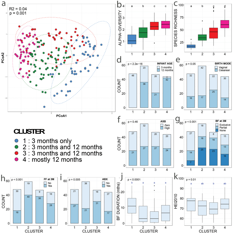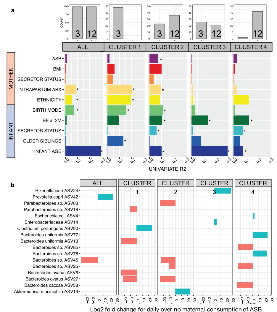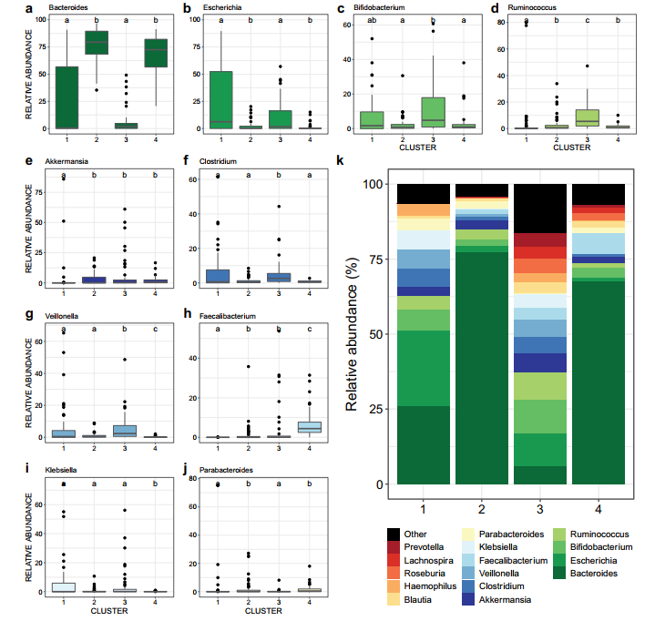 基于微生物群落組成,嬰兒糞便樣品聚類成四組(圖1-2)。腸道細(xì)菌物種豐富度(圖1b)、alpha(圖1c)、beta(圖1a)和分類學(xué)組成(圖2)在clusters之間存在差異,反應(yīng)了顯著的菌落差異。Cluster1僅包含了3個月的樣本、cluster4幾乎包括所有12個月的樣本,cluster2和3由3個月和12個月的樣本混合組成。Cluster3包括較高比例的分娩時期使用抗生素的母親、剖腹產(chǎn)出生的嬰兒和配方奶粉喂養(yǎng)(圖1)。然而,在不同clusters中母親ASB消耗量沒有差異,這表明這種暴露并不影響clusters的分類(圖1f)。