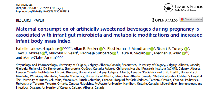 中文名稱:孕婦在懷孕期間飲用人工加糖飲料與嬰兒腸道微生物群、代謝改變和嬰兒體重指數(shù)增加有關(guān)