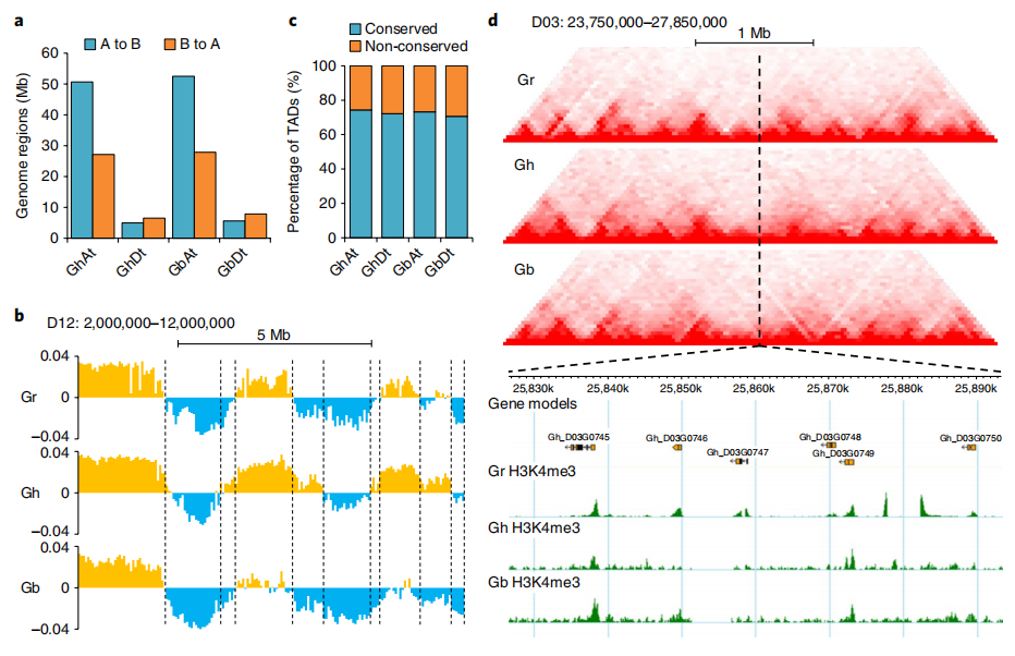 與祖先材料做研究比較更是多倍體中亙古不變的話題。物種在由祖先進化、加倍而成現(xiàn)代多倍體材料的過程中,三維結(jié)構(gòu)發(fā)生如何的變化,是否引起相關(guān)功能的差異?例如相比于二倍體亞洲棉陸地棉和海島棉的A/B compartment比較分析,發(fā)現(xiàn)存在大量A到B的轉(zhuǎn)換,以及一定區(qū)域出現(xiàn)了B到A的轉(zhuǎn)換。同時相對于祖先基因組,亞基因組發(fā)生了不同程度的Compartment的轉(zhuǎn)換,At亞基因組轉(zhuǎn)換明顯高于Dt。