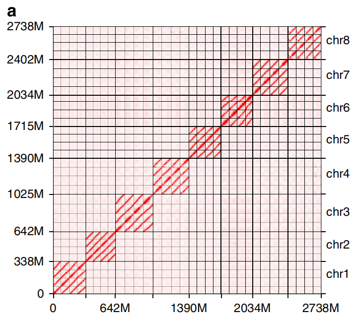 隨著單倍型的解析,不少研究發(fā)現(xiàn)在同源染色體間有大量的變異信息,而這些突變累積很可能引起等位基因的有害/有益替代。從而可以對亞基因組(同源染色體)間基因含量、GC含量、基因結(jié)構(gòu)、重復(fù)元件分布等比較、亞基因組間結(jié)構(gòu)變異(倒置、易位),結(jié)合TE分布等進行亞基因組(同源染色體)間差異分析。