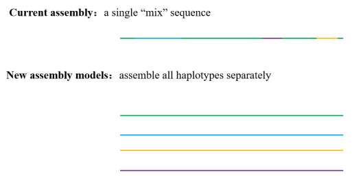 同源多倍體是指所有染色體組來源于一個個體的染色體組自我復(fù)制或同一個物種內(nèi)不同個體間的雜交與多倍化。通常二倍體基因組裝出單套基因組,異源四倍體能組裝出兩套基因組。而由于早期的技術(shù)限制,同源多倍體物種往往只能組裝1-2套(例如2017年甘薯基因組)。隨著技術(shù)的發(fā)展以及研究的深入,研究者發(fā)現(xiàn)僅單套的基因組數(shù)據(jù)難以完全演示該物種的全面信息。尤其是一些同源多倍體的物種,同源染色體之間不同遺傳位點的組合對生物表型有重要影響,如動植物中的雜種優(yōu)勢、某些物種雜交不育現(xiàn)象等。單倍型等位基因間差異對基因表達、功能及其表型都有著重要影響,大多數(shù)雜交品種的優(yōu)勢表型都受等位基因調(diào)控。