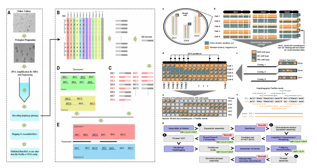 Bar-coding:將花粉單細胞結(jié)合構(gòu)建的人工染色體(BAC,artificialchromosome)進行單倍型分型。Strand-seq:短reads結(jié)合單細胞通過胸苷類似物選擇性標記去除一條DNA鏈,并可與長reads測序數(shù)據(jù)結(jié)合使用來完成單倍型分型。