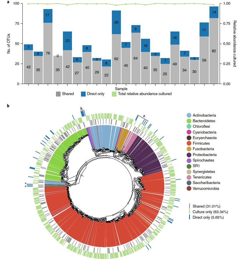 作者判斷OTU可培養的條件:1)至少10條序列;2)至少1個富集板中回收到且豐度比例至少為0.01%。直接測序鑒定到的OTU中82.13%是可培養的,這些可培養的在所有直接測序的樣本中平均豐度比例為99.3%(圖2a),富集培養擴增子測序比直接測序獲得更多的OTUs(圖2b),如樣本1恢復到49個OTUs,其中42個在富集培養中也恢復到,富集培養還恢復了額外的124個OTUs(圖2a)。