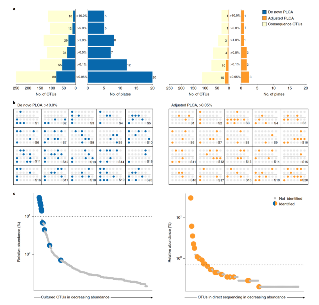 作者采用了PLCA算法,來決定需要進行富集培養宏基因組測序的最小樣品數,算法對任何含有大部分可培養富集的菌群生態均適用。PLCA算法有兩個版本,從頭 PLCA不依賴于直接測序結果再現富集培養菌群,而校正PLCA側重于直接測序結果中OTU的修復,這取決于是否都對原始樣品的菌群組成感興趣。采用這兩種算法,數據集凸顯了不同樣本的獨特性:從頭PLCA顯示,每個樣本具有獨特的平板集,并且每個培養條件對每個樣本都是必要的;校正PLCA顯示對數據集中樣本進行富集培養宏基因組測序是很有必要的(圖4a,b)。