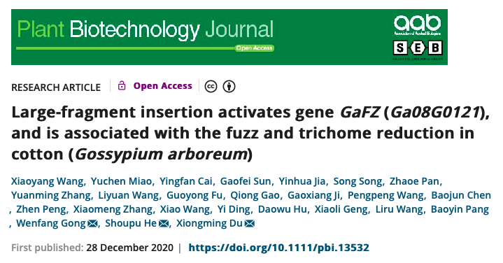 棉花是重要的天然纖維經濟作物,在全球廣泛種植。今天給大家推薦的這篇文章是近日中棉所杜雄明老師團隊與河南大學苗雨晨、蔡應繁老師團隊合作解析的研究成果“Large-fragment insertion activates gene?GaFZ?(Ga08G0121), and is associated with the fuzz and trichome reduction in cotton (Gossypium arboreum)”,該研究報道了一個新的棉花種子短絨/葉茸毛調控因子,并闡述其遺傳機制,最終該成果發(fā)表在國際知名期刊Plant Biotechnology Journal(IF=8.154)。
