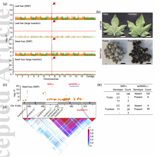 本研究中,作者利用215份亞洲棉自然群體,在前人基于SNP標記的GWAS基礎上(Du et al.?2018),基于SV(結構變異)標記對種子短絨和葉茸毛性狀進行GWAS,鑒定得到位于A08染色體末端的一個非編碼插入片段larINDELFZ與短絨和葉茸毛表型顯著相關(圖1a, b);連鎖不平衡分析發(fā)現,在關聯區(qū)域有4個連鎖不平衡(LD)位點,SNPFZ不位于這些位點內(圖1c, d);對SNPFZ和larINDELFZ基因型與種子短絨的相關性進行研究,發(fā)現只有l(wèi)arINDELFZ基因型與無茸毛表型高度相關(圖1e)。以上結果表明,插入片段larINDELFZ與種子短絨和葉茸毛性狀顯著相關。