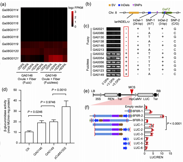 作者對關聯區(qū)域內8個基因的表達模式分析,發(fā)現在短絨發(fā)育起始階段,無絨材料中GaFZ基因表達顯著高于短絨材料(圖3a);從GWAS群體中隨機挑選各6個短絨和無絨材料進行基因和啟動子序列分析,發(fā)現larINDELFZ存在于所有的無絨材料中(圖3b, c);熒光素酶活性分析實驗結果表明,larINDELFZ可能扮演遠端增強子角色特異激活其下游短絨發(fā)育關鍵基因的GaFZ?表達(圖3d, e)