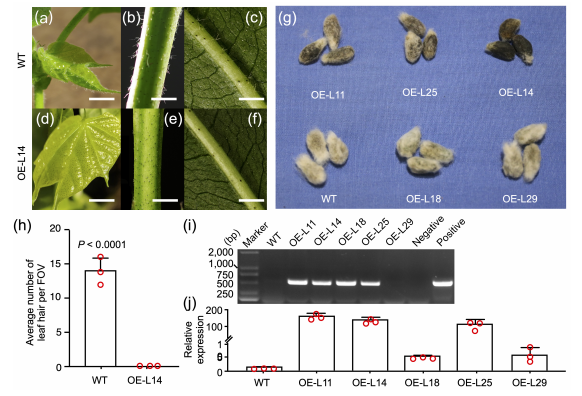 為了進一步驗證GaFZ基因的功能,作者分別在擬南芥和有短絨的陸地棉中過表達GaFZ基因,發(fā)現轉基因擬南芥葉茸毛的發(fā)育收到了明顯的抑制,同時轉基因棉花株系的莖毛、葉茸毛和短絨的發(fā)育也均受到了不同程度的抑制(圖a-h);但是,轉基因棉花和擬南芥中根毛的數量均沒有發(fā)生變化;qRT-PCR分析顯示,過表達株系中GaFZ基因顯著高于野生型(圖4i-j);結果表明,GaFZ基因可以抑制葉茸毛和短絨纖維的發(fā)育,而對根毛的發(fā)育沒有抑制作用。