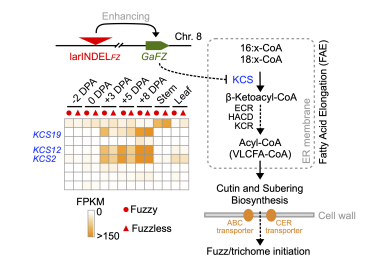 作者進一步在短絨和無絨棉花材料和過表達的擬南芥材料中分析全基因共表達譜,在擬南芥和棉花的短絨關鍵發(fā)育階段,共鑒定出1343個和367個差異表達基因,這些基因主要參與次生代謝,如脂肪酸伸長和角質、栓質和蠟質的生物合成;結合互作分析發(fā)現,GaFZ基因可能通過抑制超長鏈脂肪酸伸長途徑中關鍵基因的表達,進一步抑制脂肪酸延伸的下游途徑,從而影響短絨/葉茸毛的發(fā)育。作者基于基因功能分析,提出了一個亞洲棉短絨發(fā)育的可能機制(圖5)。