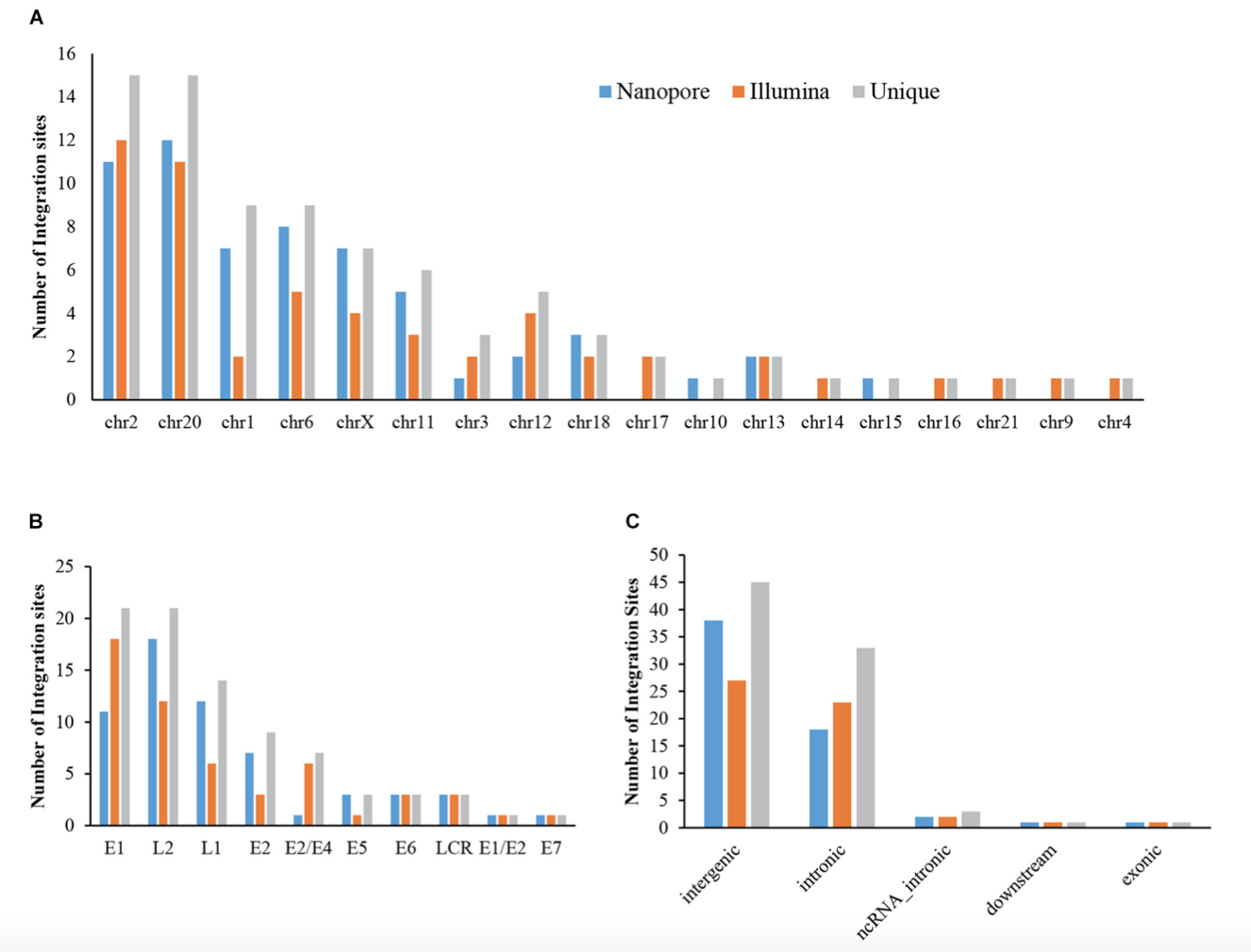 在Illumina測序獲得的54個整合位點(diǎn)中,有19個與之前報道的相符。整合所有位點(diǎn)并做韋恩圖(圖4),有13個位點(diǎn)是3種數(shù)據(jù)(Nanopore、Illumina、published)都存在的,這表明不同平臺間重復(fù)性很好。共有18個位點(diǎn)同時出現(xiàn)在Nanopore和Illumina中,三個位點(diǎn)同時出現(xiàn)在納米孔測序和以前發(fā)表的論文中,只有一個位點(diǎn)在Illumina和已發(fā)表的論文重疊。在兩個平臺中確定的整合位點(diǎn)中,一些斷點(diǎn)具有高度豐富的reads數(shù),例如HPV16:2804,chr20:32516985,Nanopore結(jié)果中有406個reads,Illumina結(jié)果中有1439個reads。其他斷點(diǎn)的reads數(shù)很少,例如HPV16:4250,chr21:97550764,其中Nanopore結(jié)果中有兩個reads,而Illumina結(jié)果中只有四個reads。