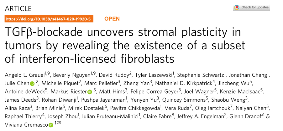 總之,這些數據表明,TGFβ-阻斷可導致小鼠和人類腫瘤成纖維細胞的重塑,暴露了一種獨特的CAF群體的誘導,其特征是對IFN的明顯反應和相當大的免疫調節潛能。