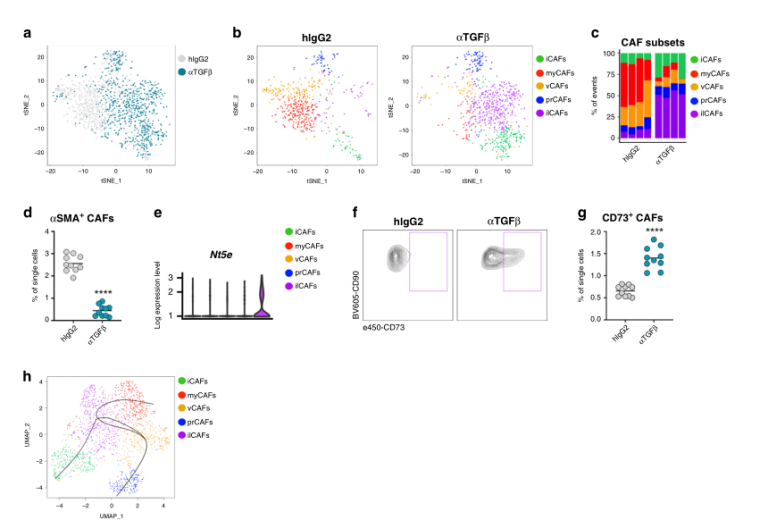 值得注意的是,在TGFβ-阻斷下肌成纖維細胞的丟失與一種獨特的CAFs(后來被稱為干擾素許可的CAFs, ilCAFs,圖4b, c為紫色)的出現形成對比,揭示了腫瘤微環境更廣泛的可塑性。ilCAFs很容易從其他CAF亞群中區分出來,因為與外切核苷酶Nt5e的基因及編碼的蛋白CD73上調相關(圖4f)。