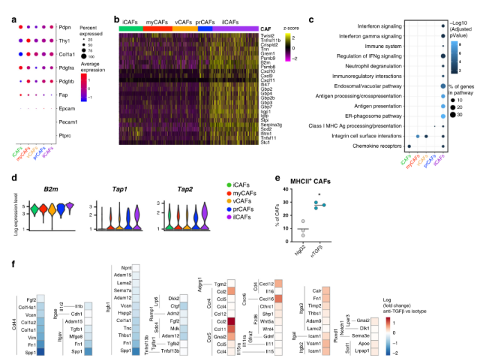 為了獲得關于新鑒定的CAF亞群功能特性的更多信息,作者研究了這類亞群的轉錄特征。然而,對ilCAFs中差異表達基因分析發現,在干擾素(IFN)信號控制下許多鳥苷晚結合蛋白(Gbp)家族成員發生富集(圖5b)。與這些發現一致的是,在區分ilCAFs與其他CAF亞群的基因中, ilCAFs中IFN信號反應上調,IFN水平調控的通路增強,包括抗原加工和展示(圖5c)。編碼MHC蛋白和MHC相關分子的基因在ilCAFs中高表達(圖5b-d)。體內TGFβ-阻斷后,在CAFs中檢測到MHCII蛋白上調(圖5e),也發現ilCAFs在腫瘤內對指導T細胞的轉運發揮重要作用(圖5b)。