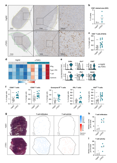 TGFβ-中和后CAF重塑,特別是具有潛在T細胞調節活性的CAF亞群的出現,促使我們確定TGFβ-阻斷對建立抗腫瘤免疫反應的影響。由于ilCAFs中T細胞趨化分子基因表達升高,CD8免疫組化染色顯示細胞毒性T細胞浸潤在治療組之間存在較大差異(圖6a)。流式細胞分析證實了TGFβ-阻斷作用下細胞毒性T細胞數量的增加(圖6c),支持TGFβ-阻礙可能導致免疫細胞反應的全面覺醒。在單細胞水平上也證實了這些發現。為了評估這種與浸潤T細胞組織分布相關的激活程度,我們隨后通過空間轉錄組分析生成了與T淋巴細胞存在及其活性相關基因的腫瘤路圖。