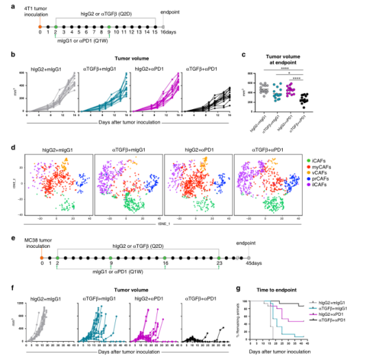 綜上所述,這些數據促使我們研究TGFβ-阻斷劑在體內對CAF表型和功能的相對影響。為此,6周齡雌性小鼠接種4T1腫瘤細胞,隨后用TGFβ阻斷抗體或同型對照處理,研究設計如圖2c所示。結果表明這種腫瘤進展的延遲似乎不是由抗TGFβ對腫瘤細胞的直接作用引起的,更可能是TGFβ阻斷后微環境變化的結果。事實上,使用TGFβ中和抗體可導致整體基因表達的顯著差異,這在對大量冷凍腫瘤RNAseq分析中得到證實(圖2f)。與這些發現一致的是,我們通過分析與膠原沉積和纖維化相關的基因特征,描述了抗tgfβ治療小鼠腫瘤中整體促纖維化程序的顯著減少(圖2h)。綜上所述,這些數據表明靶向TGFβ影響了腫瘤微環境中的成纖維細胞動力學。