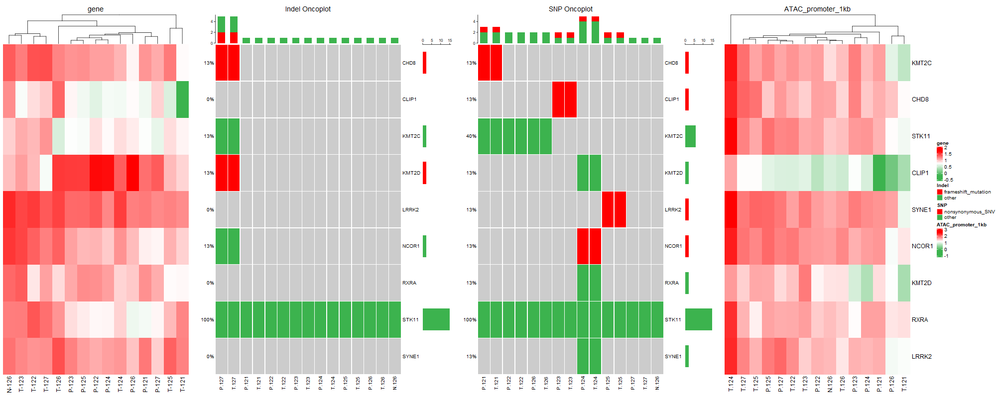 其中需要注意的是當有多個基因瀑布圖時,alter_fun和col需在同一條命令中設置。通過以上一頓操作,快速將基因瀑布圖和熱圖組合在一起,既展示了基因的結構變異、開放狀態、基因表達,呈現多組學的角度探討疾病發生發展。這不就完成了Fig1還升華了Fig1的深度。
