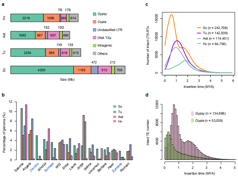與烏拉爾圖小麥、節節麥及大麥的LTR-RTs進行比較發現:(1)Gypsy是威寧黑麥基因組擴張的主要原因之一(Fig. 2a),并且有3個LTR-RT家族(Daniela, Sumaya, Sumana)在威寧黑麥中特異擴張,其中Daniela的占比最高 (Fig. 2b)。(2)威寧黑麥中完整的LTR-RTs插入時間存在獨特的雙峰分布(Fig. 2c),最近一個擴增峰出現在50萬年前,另出現在1.7 百萬年(MYA)左右(與大麥相同) (Fig. 2c)。(3)這種雙峰分布模式由Gypsy?RTs的擴增主導(Fig. 2d)。