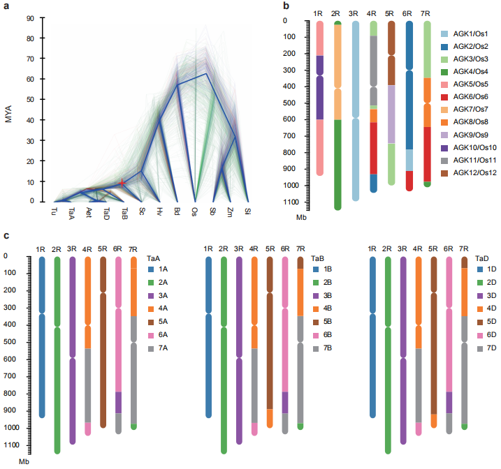 通過比較威寧黑麥、烏拉爾圖小麥、節節麥、普通小麥(亞基因組TaA、TaB和TaD)、大麥、水稻Os(Oryza sativa ssp.?japonica)、二穗短柄草Bd(Brachypodium distachyon)、玉米Zm(Zea mays)、高粱Sb(Sorghum bicolor)、谷子Si(Setaria italica)基因組,共找到2517個單拷貝同源基因。通過對單拷貝基因組構建進化樹和計算分化時間發現,在大麥和小麥分化后(15MYA)黑麥和二倍體小麥發生了分化(9.6 MYA) (Fig. 3a)。
